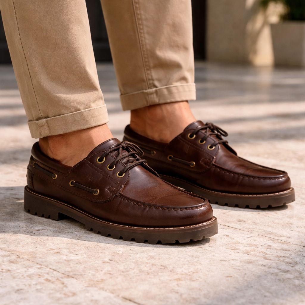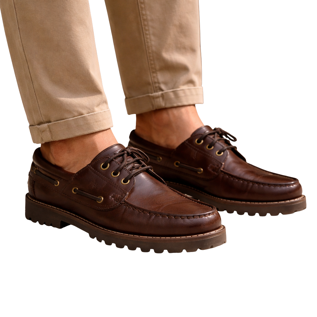 Cuando te calzas este náutico, sientes la textura rica de la piel chocolate que se adapta al pie con naturalidad. El tono profundo transmite sobriedad y sofisticación, mientras la suela de goma proporciona una sensación de solidez al caminar. El ligero eco del cordón al ajustarse refuerza la idea de que se trata de un zapato realizado con atención al detalle.