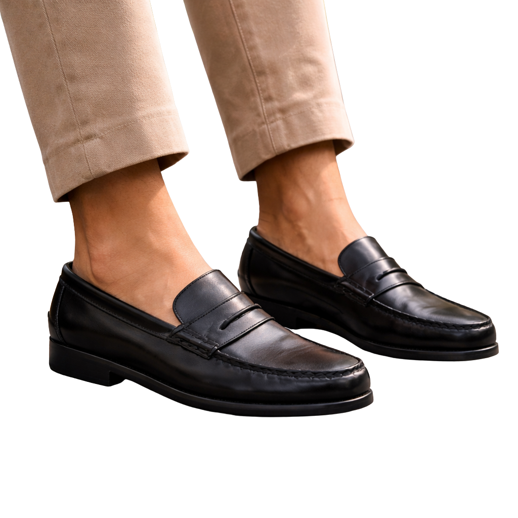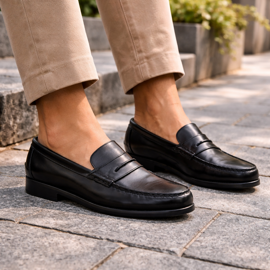 Al calzarlo, la piel negra envuelve el pie con suavidad firme y transmite una sensación de calidad inmediata. La suela de goma ofrece soporte seguro y amortigua el paso, mientras el acabado liso refleja una presencia cuidada y sofisticada. Cada pisada se siente estable, confortable y con estilo.