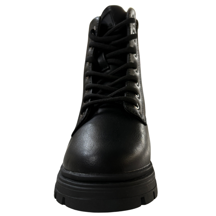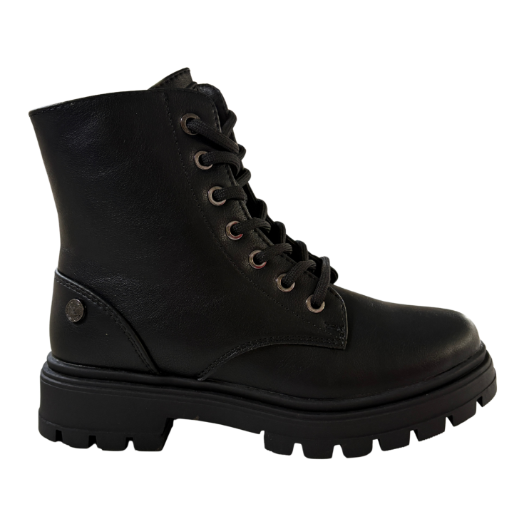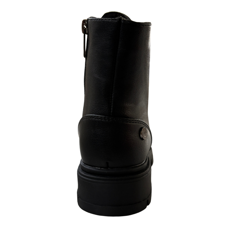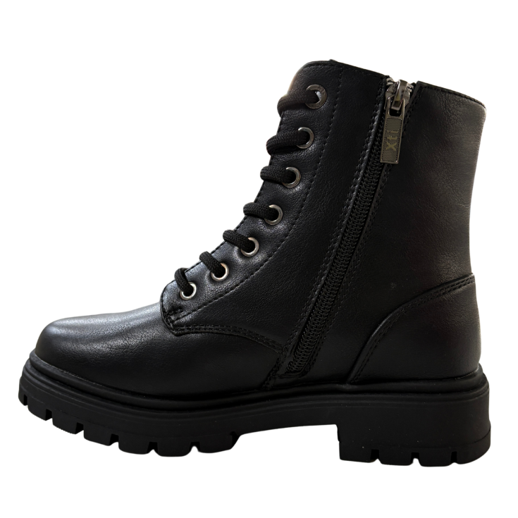 Con su estética militar y acabado en negro liso, este botín de XTI aporta fuerza y estilo a cualquier look. Su suela track robusta garantiza estabilidad y agarre, mientras que el diseño con cordones asegura un ajuste firme y confortable durante toda la jornada.
