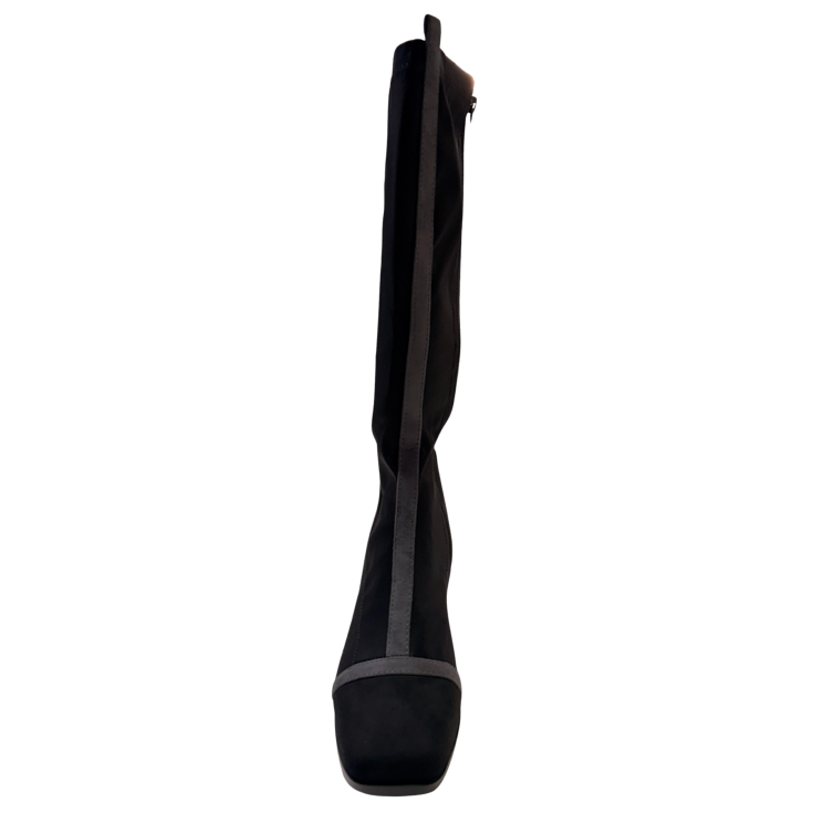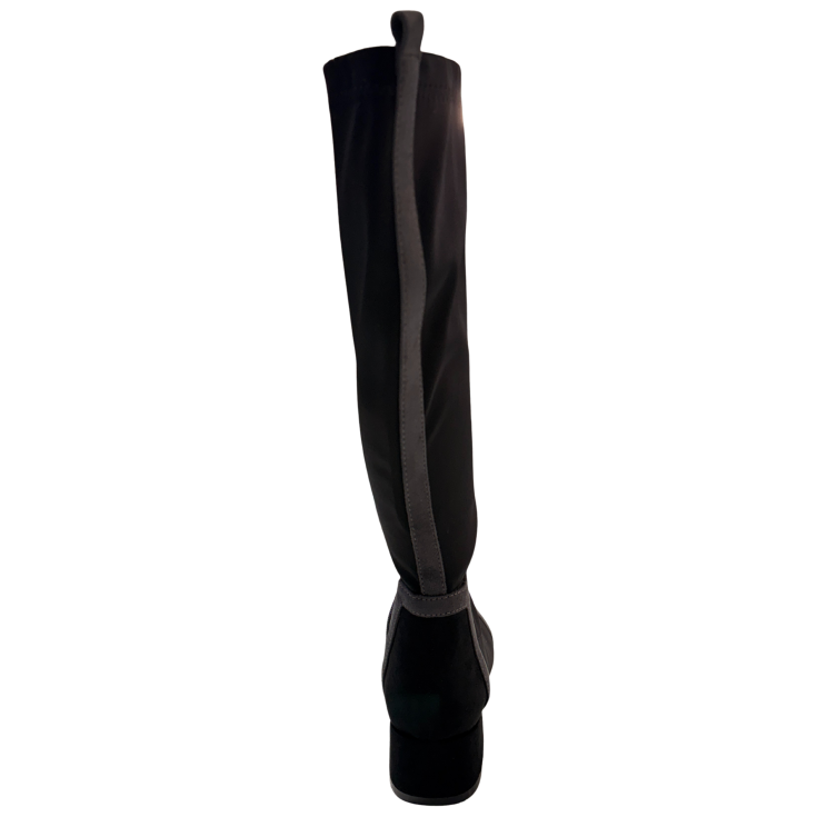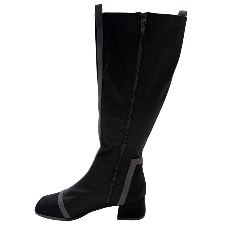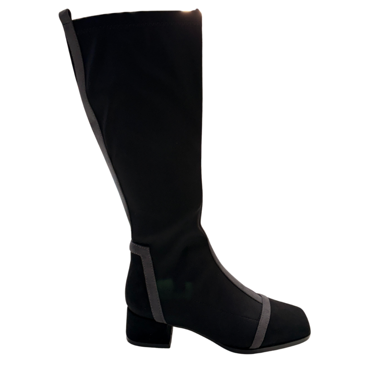 El material suave envuelve la pierna con una sensación firme pero agradable, adaptándose al movimiento al caminar. El tacón bajo aporta seguridad y equilibrio, haciendo que cada paso se sienta ligero y estable.