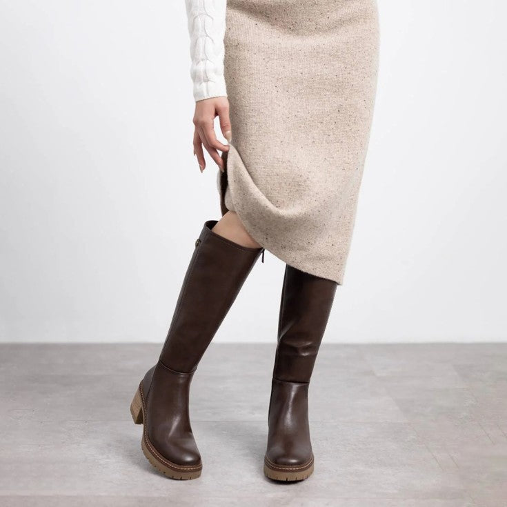 La Bota Alta Sevilla XTI Marrón es el equilibrio perfecto entre estilo, comodidad y tendencia. Su acabado marrón chocolate y su diseño de caña alta crean un look cálido, versátil y fácil de combinar para la temporada otoño–invierno.