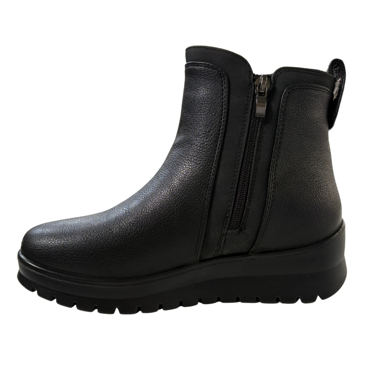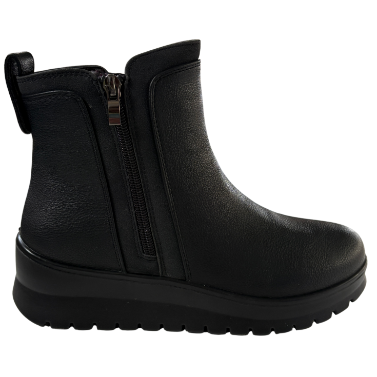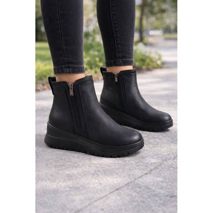 Con un diseño limpio y atemporal en color negro, este botín con cuña integrada estiliza la figura de forma natural. Su estructura envolvente y su cierre con cremallera lateral facilitan el calce, mientras que la cuña ofrece una pisada cómoda y estable durante todo el día.