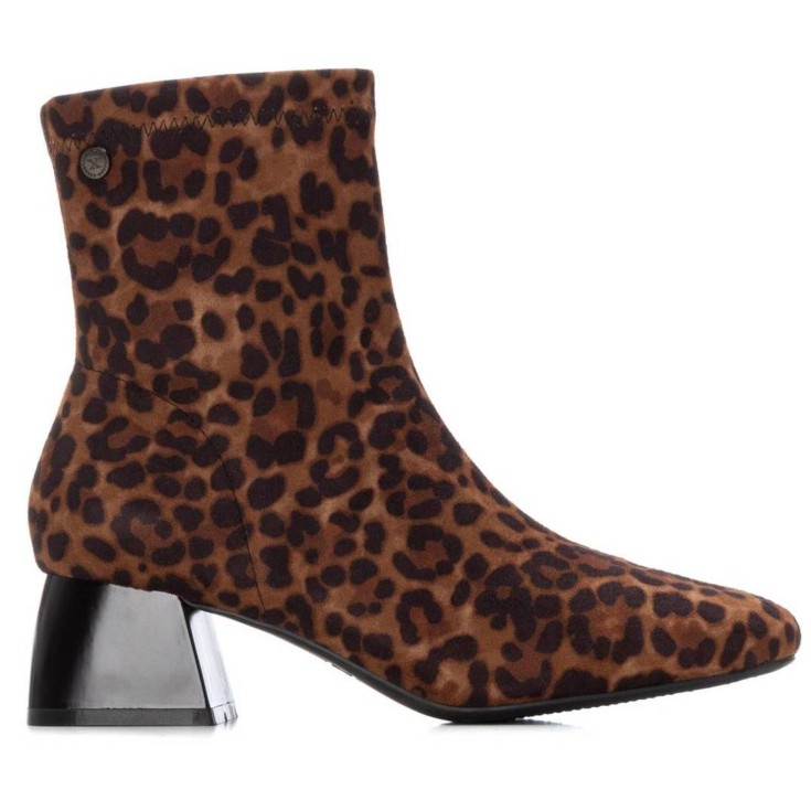 El Botín Tacón XTI Amsterdam en ante estampado leopardo es un modelo atrevido y con personalidad, perfecto para quienes buscan marcar tendencia. Su diseño en textura suave con estampado animal print se combina con un tacón medio de acabado metalizado, logrando un estilo moderno y sofisticado.