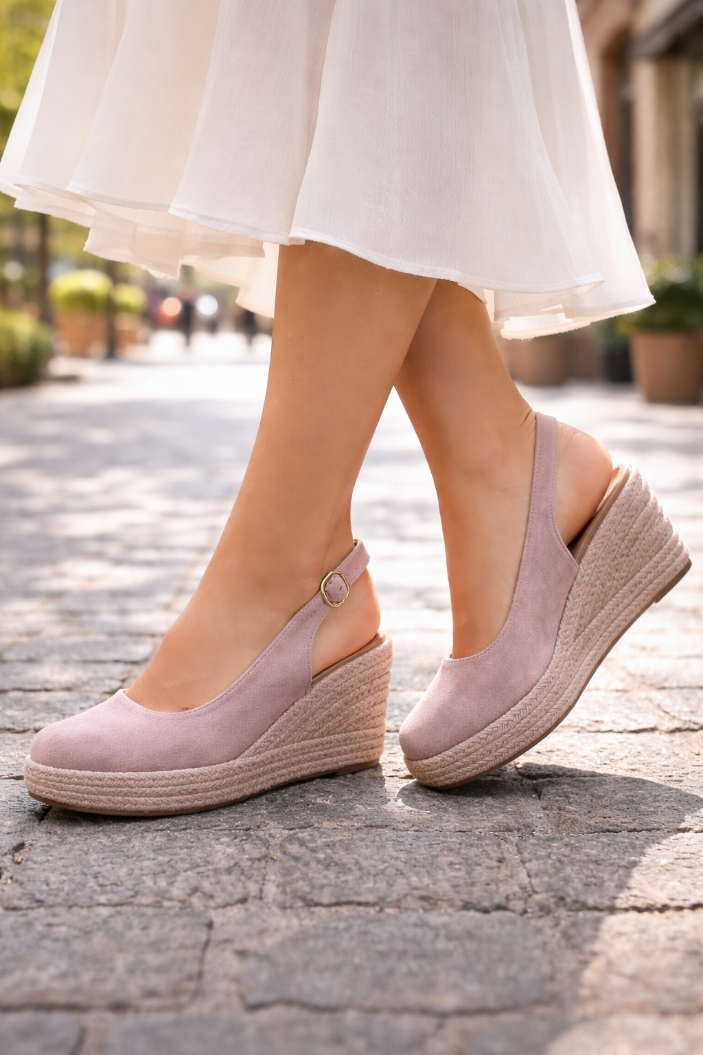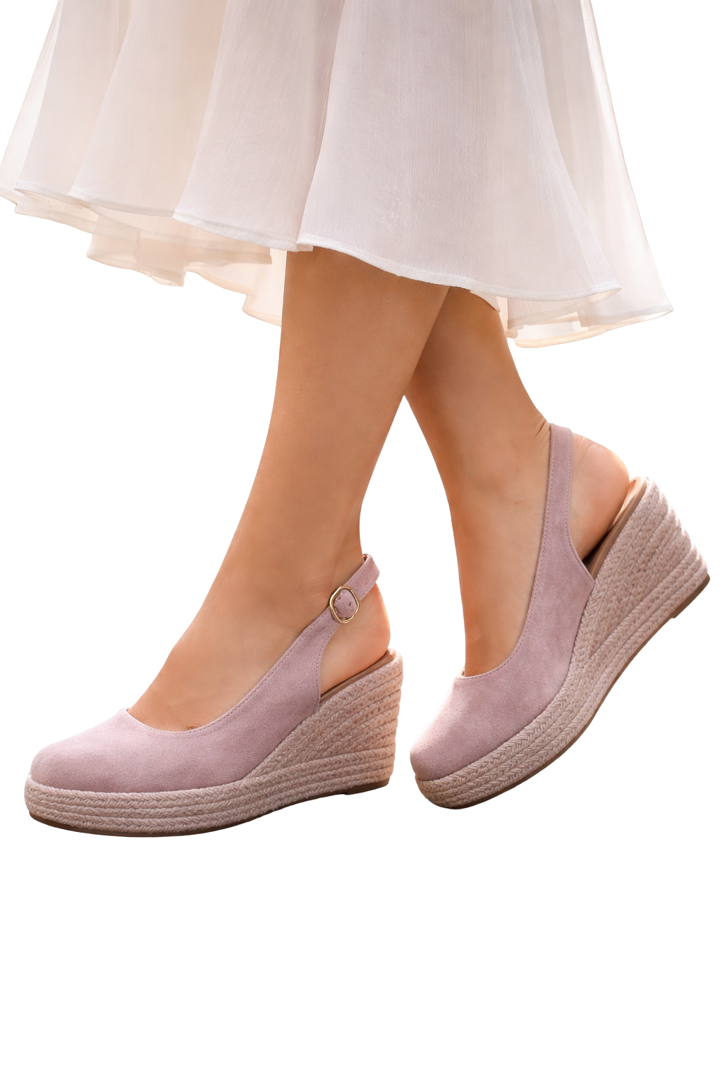 La cuña de esparto aporta una textura natural y cálida, evocando frescura y ligereza en cada paso.
