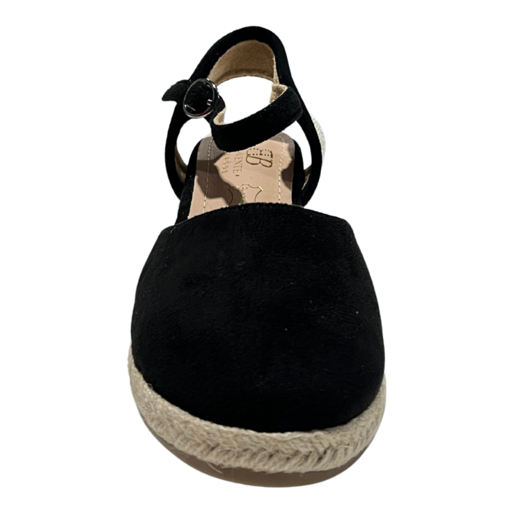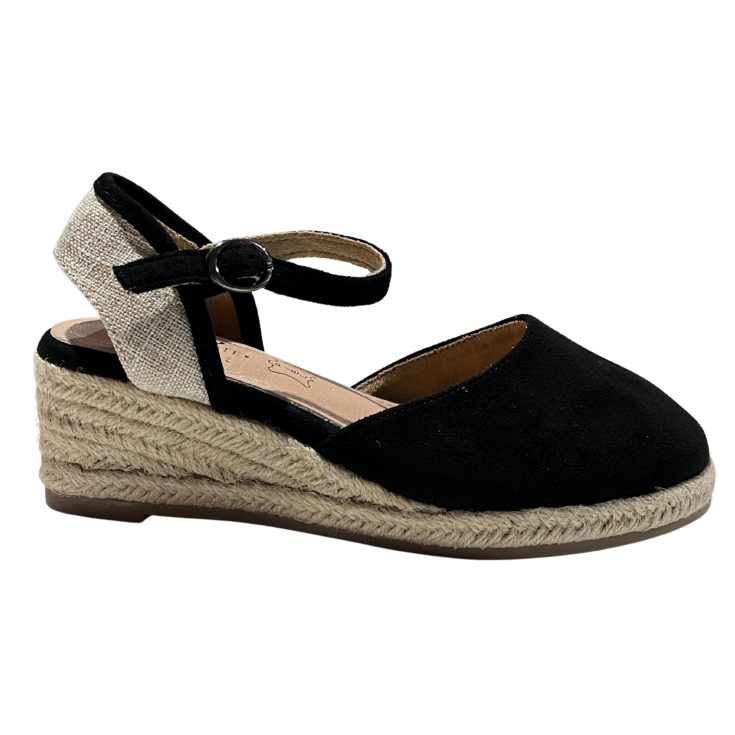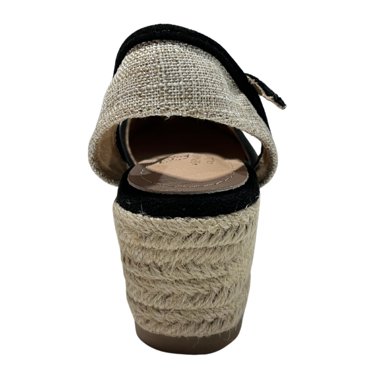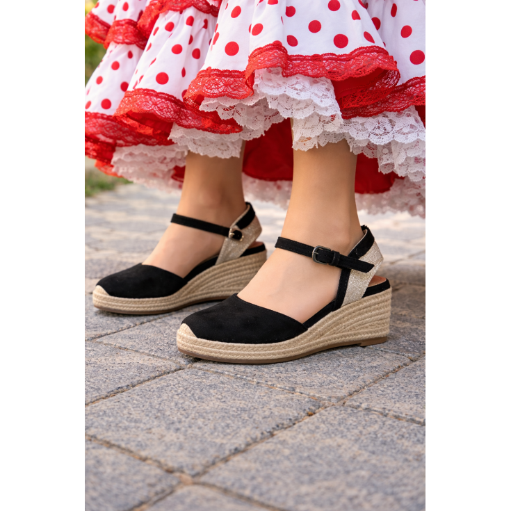El tacto suave del material negro envuelve el pie con delicadeza, mientras que la cuña de esparto aporta una sensación natural y fresca. La combinación de plataforma y cuña proporciona una pisada firme y equilibrada, permitiendo caminar con comodidad durante horas.