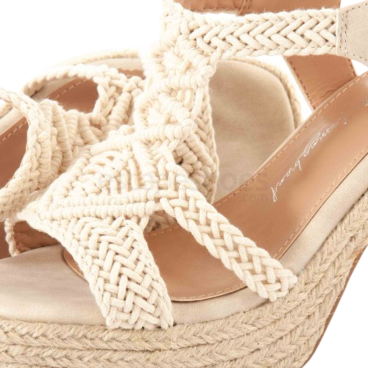El tacón ancho forrado en cuerda aporta altura sin renunciar a la comodidad, mientras que la plataforma suaviza la pisada. El cierre de hebilla en el tobillo garantiza un ajuste seguro y favorecedor.