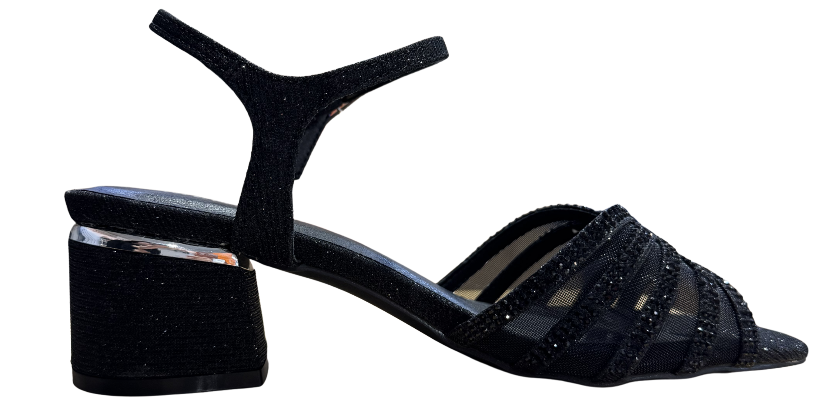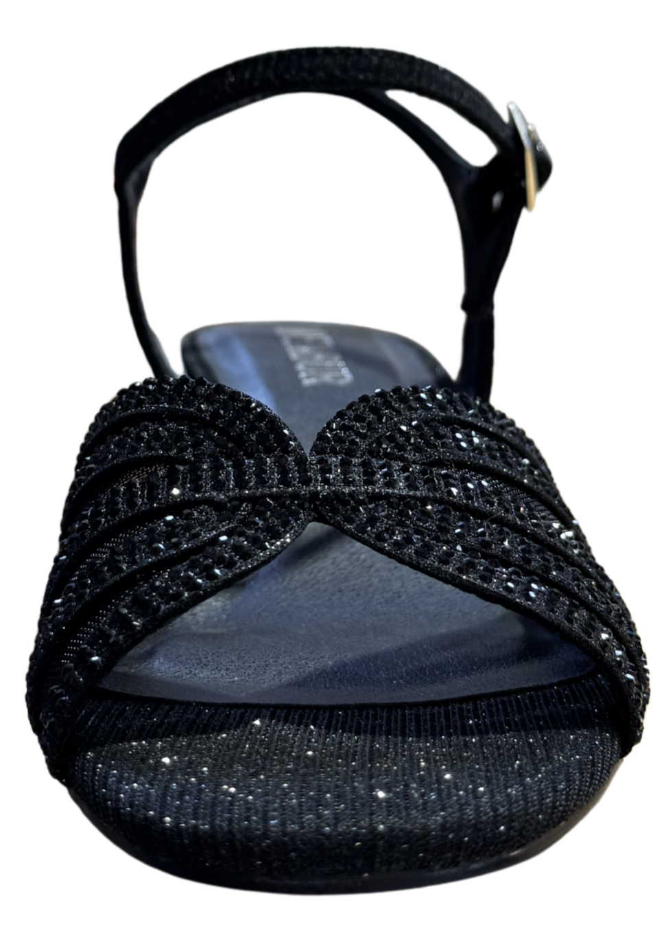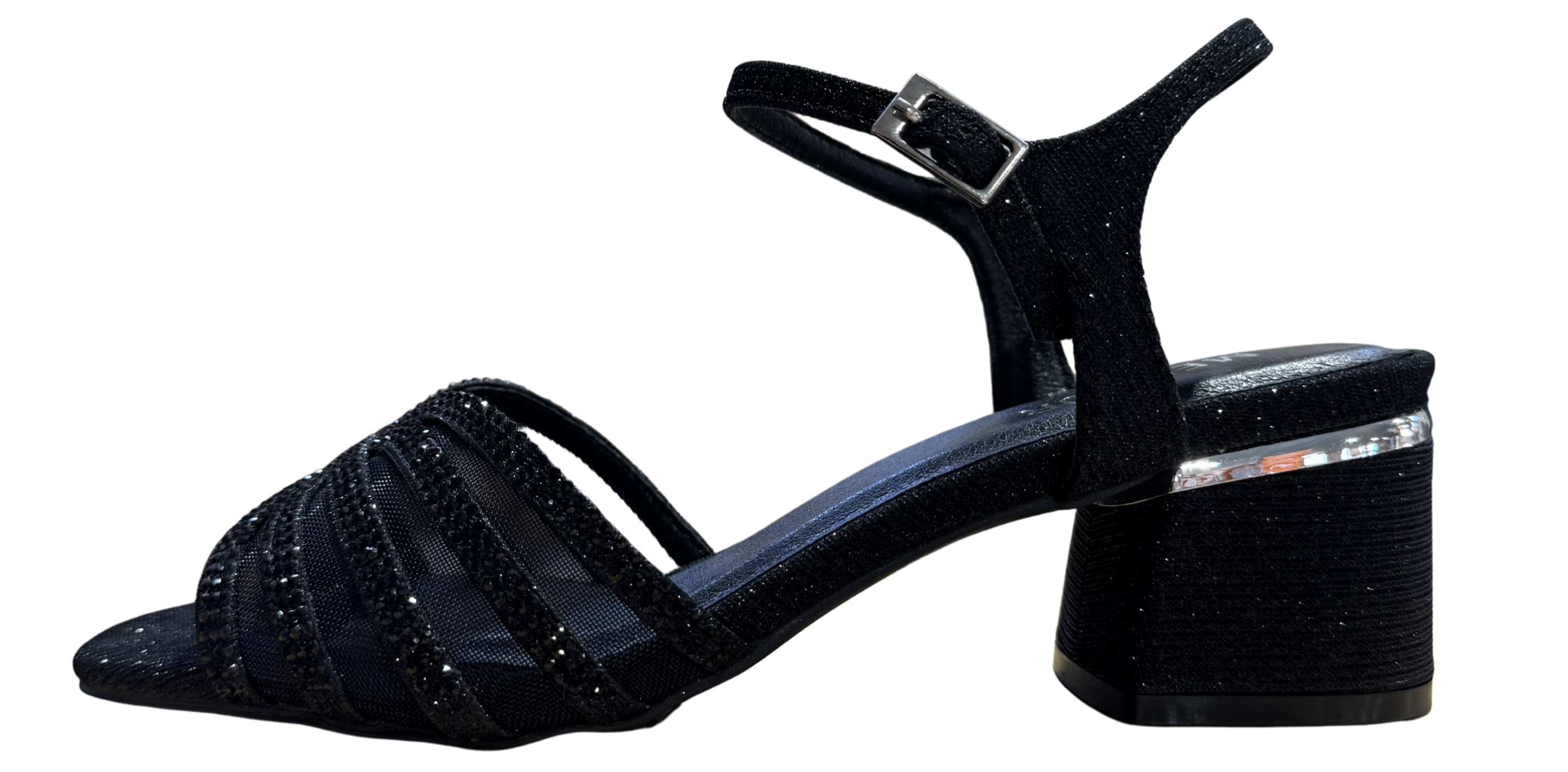 ● Tiras delanteras con pedrería sobre base translúcida para un efecto elegante