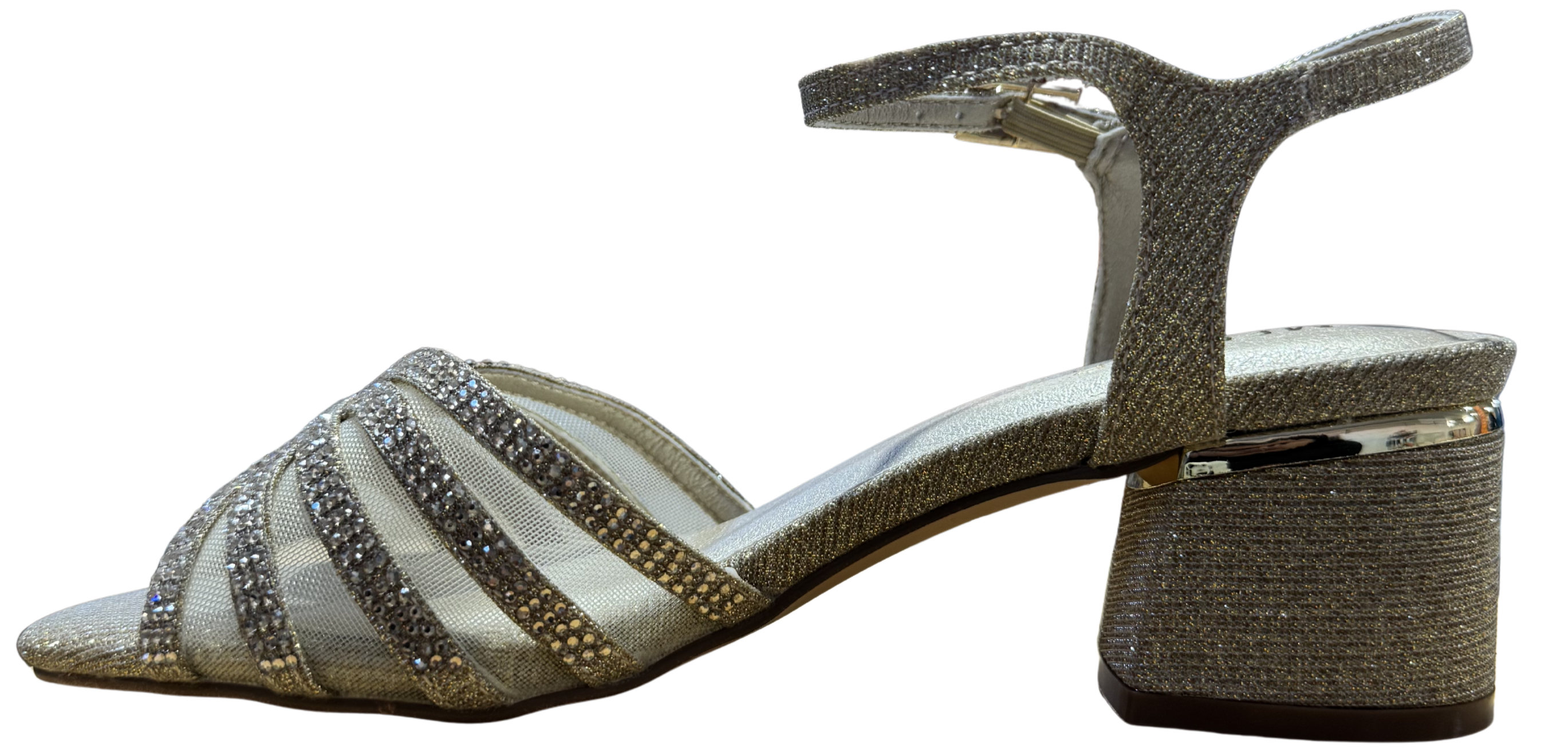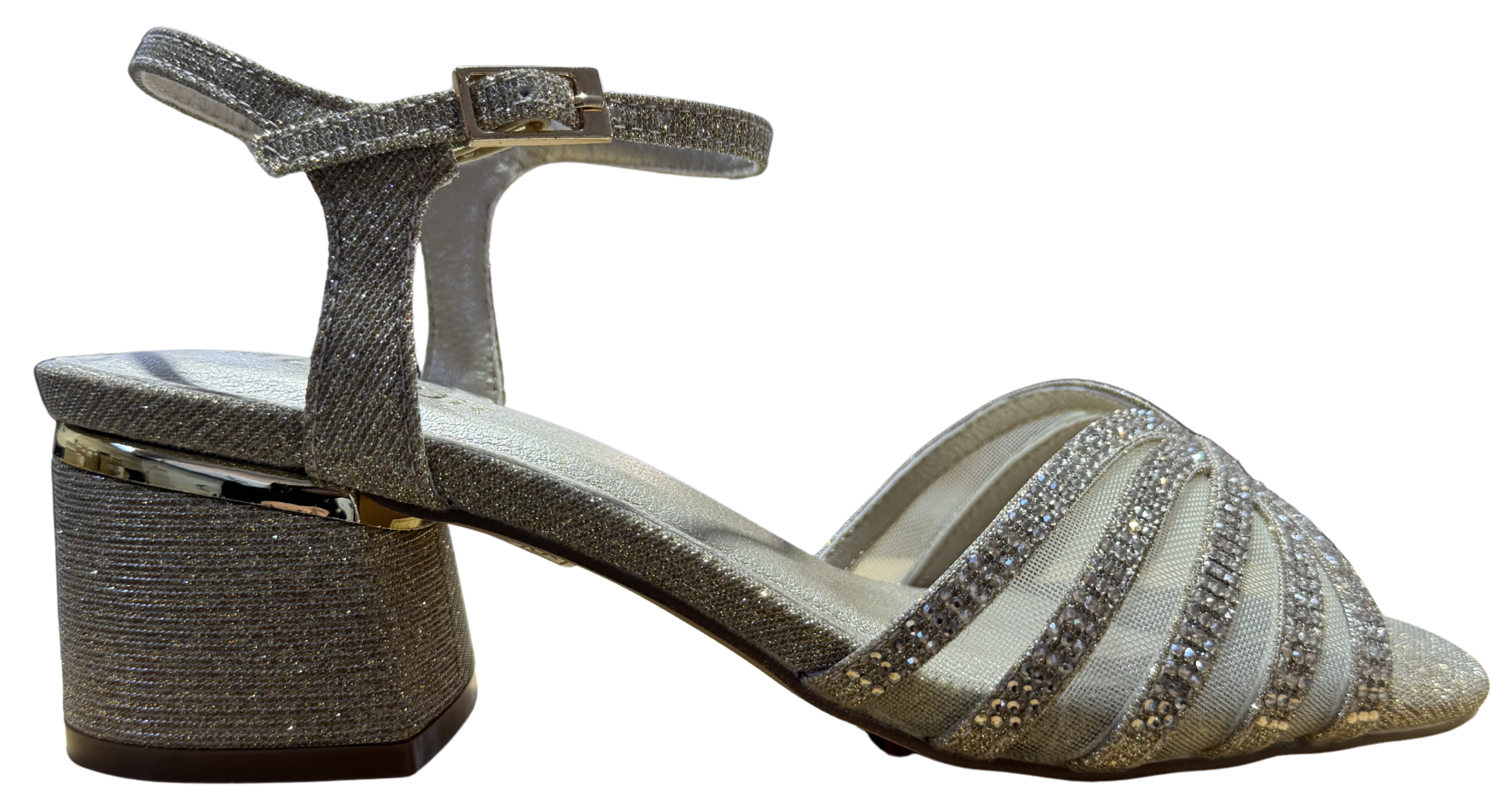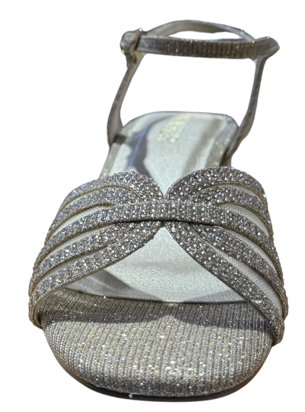El suave acabado textil envuelve el pie con delicadeza, mientras los destellos de la pedrería capturan la luz en cada movimiento.