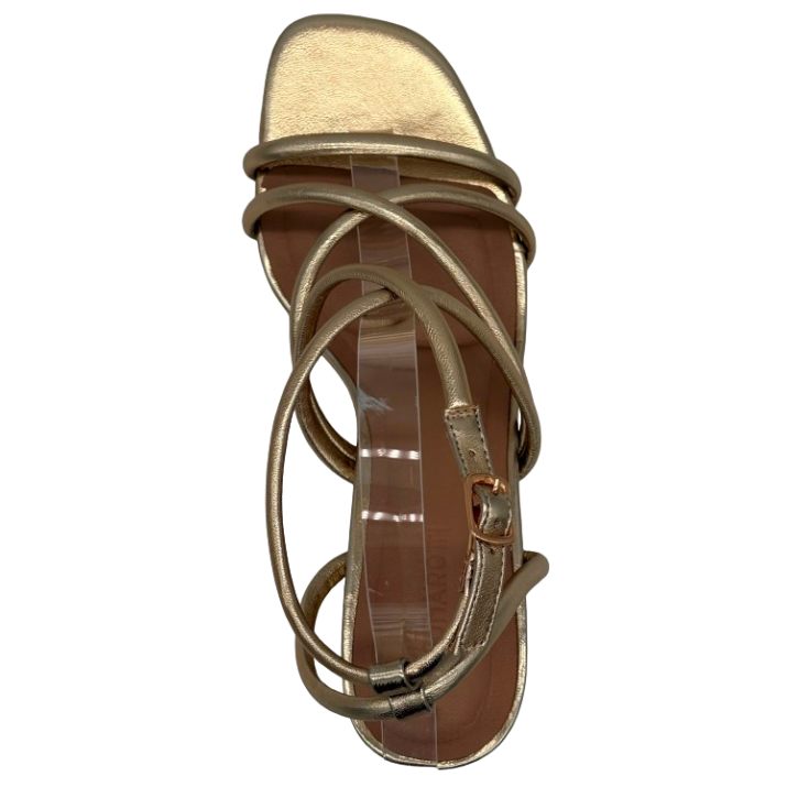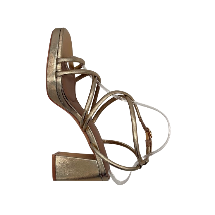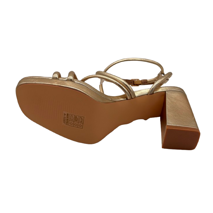 Una sandalia de fiesta diseñada para brillar en cada paso. Su acabado metalizado en tono oro, las finas tiras cruzadas y su tacón ancho la convierten en la opción perfecta para vestir con elegancia y comodidad en tus eventos más especiales.