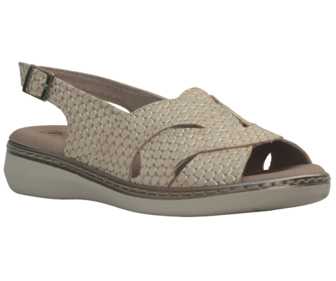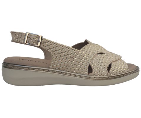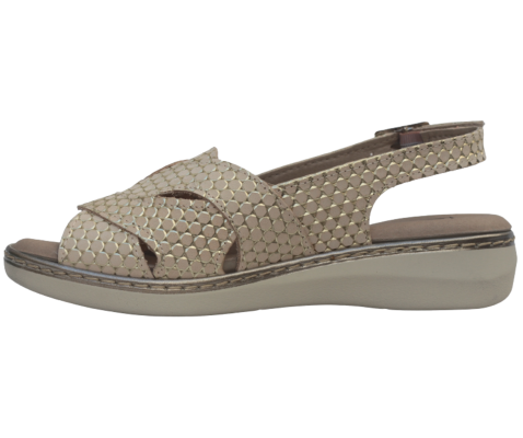 Sandalia para señora marca pitillo en color oro. Sandalia en piel con cierre de hebilla lateral. Plantilla extraible  3  cm altura.