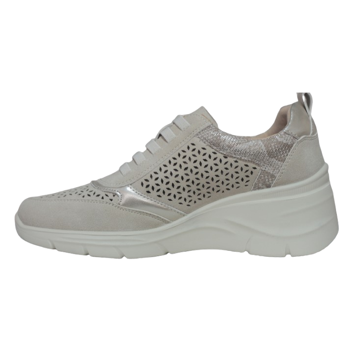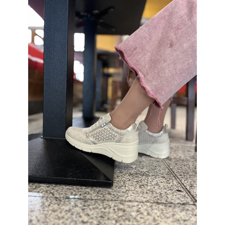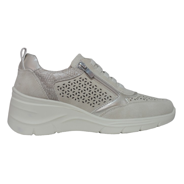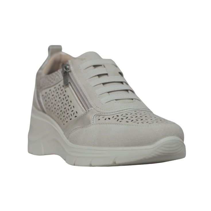 Con una plataforma de 2 cm y una cuña de 6,5 cm, este zapato ofrece una pisada estable y ligera. Además, su combinación de cordones elásticos y cierre de cremallera lateral permite un ajuste rápido y sin esfuerzo, ideal para el día a día.