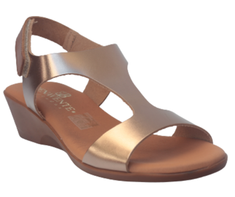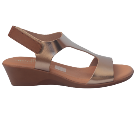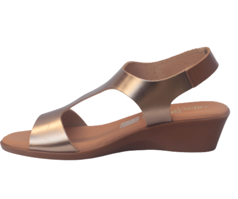 Sandalia Lía, este modelo es de piel, en color cava, cierre de tobillo con velcro para faciltar ponerlo, plantilla de gel, cuña de 4 cm y plataforma de 2,5 cm.