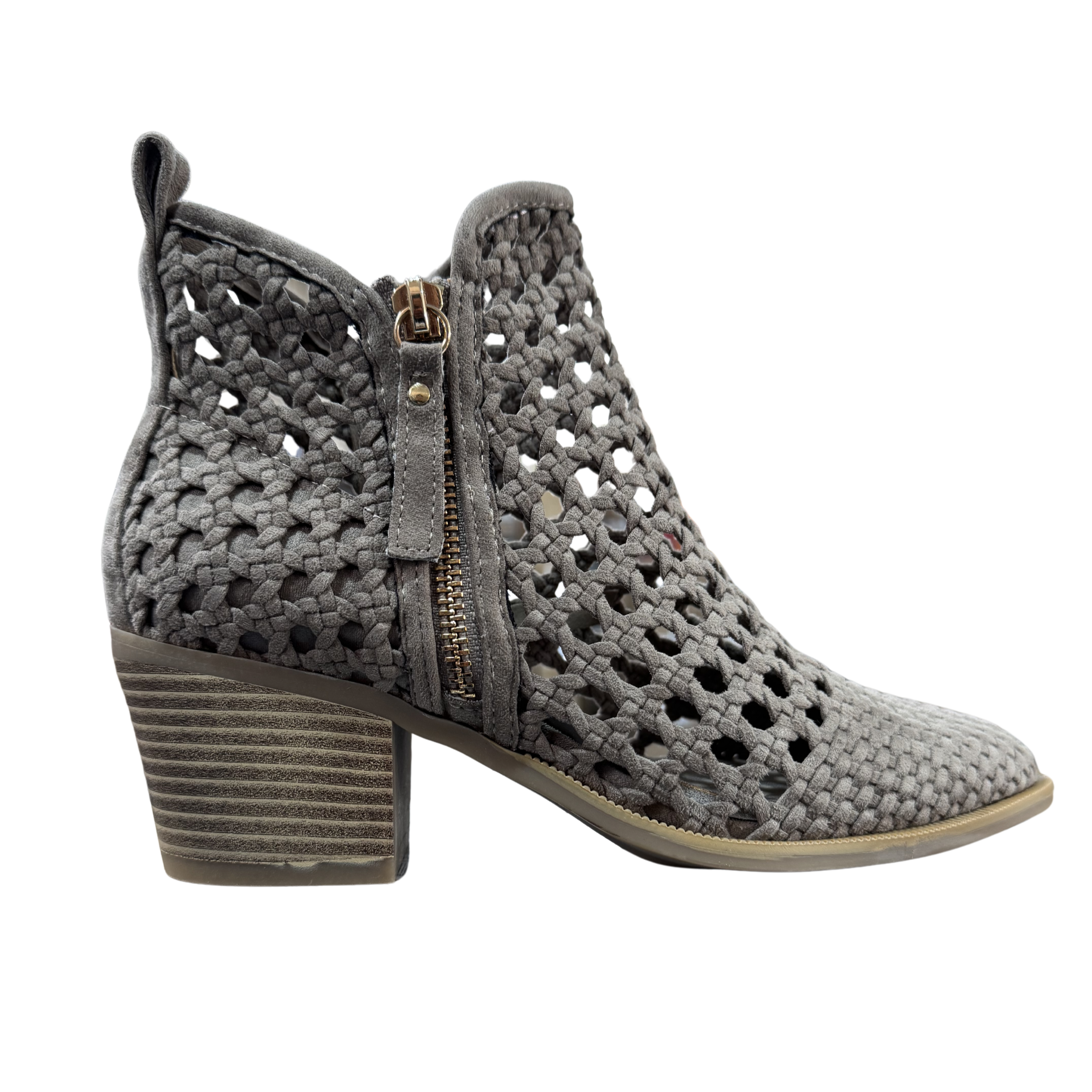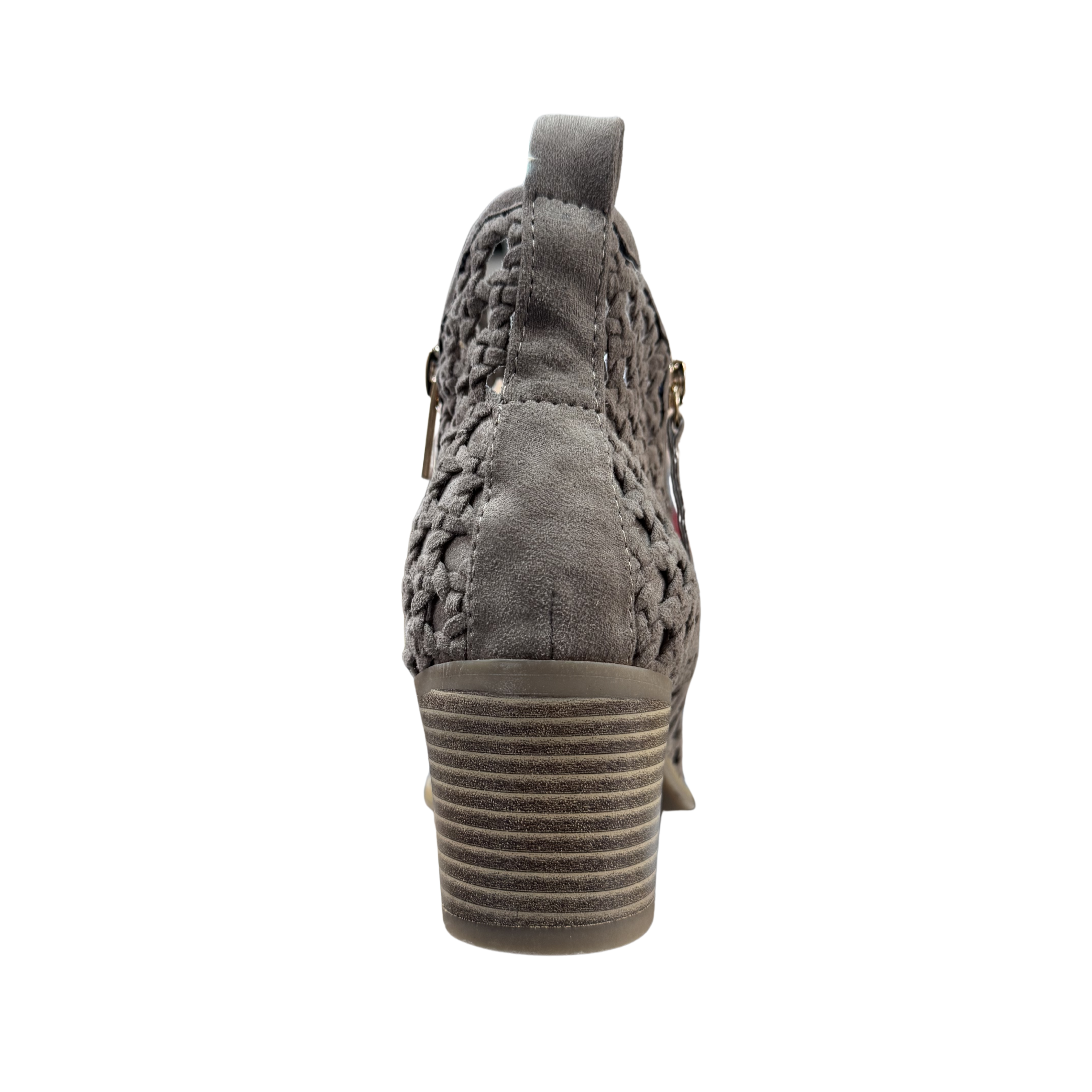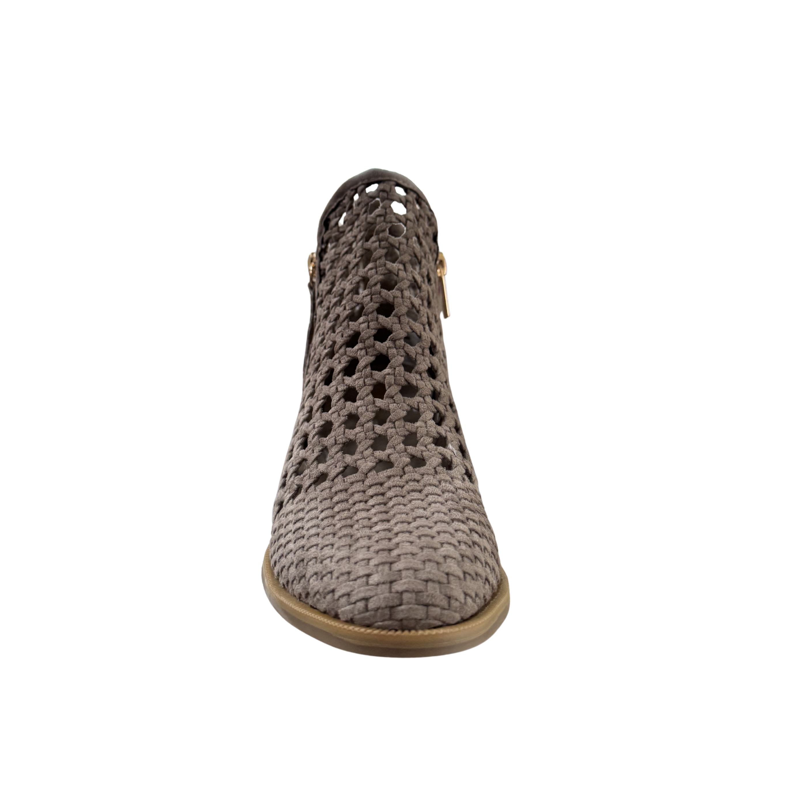 ● Diseño en antelina taupe con acabado trenzado y troquelado