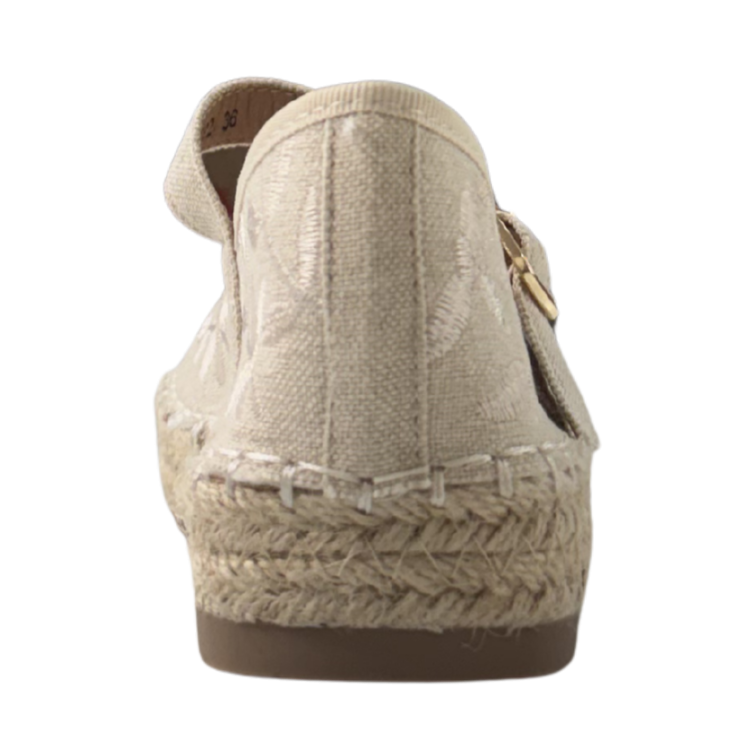 Diseñada para acompañarte en los días más cálidos, esta alpargata combina un tejido bordado en tono beige con una base de esparto natural que aporta frescura y ligereza. Su pulsera con hebilla ajustable proporciona una sujeción cómoda y segura, convirtiéndola en una opción ideal para looks veraniegos, desde estilos casuales hasta conjuntos más cuidados.