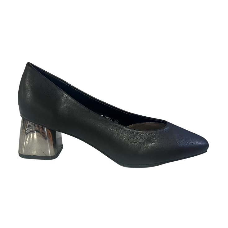 Diseño minimalista con un giro contemporáneo. El Zapato de Salón Caroli Negro redefine el clásico salón negro incorporando un tacón efecto espejo de 5 cm que aporta modernidad y sofisticación. Elegante, versátil y con personalidad propia, es el modelo perfecto para mujeres que buscan un básico diferente para oficina, eventos o looks formales con estilo.