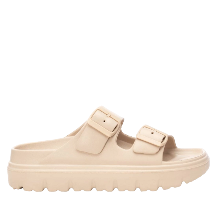 Sandalia Irin, modelo de la marca Xti en color beige, ideal para los días de piscina y playa, plataforma de 2,5 cm, doble cierre de hebilla en la parte de la pala, puntera redonda y levantada para garantizar la comodidad, suela de goma antideslizante