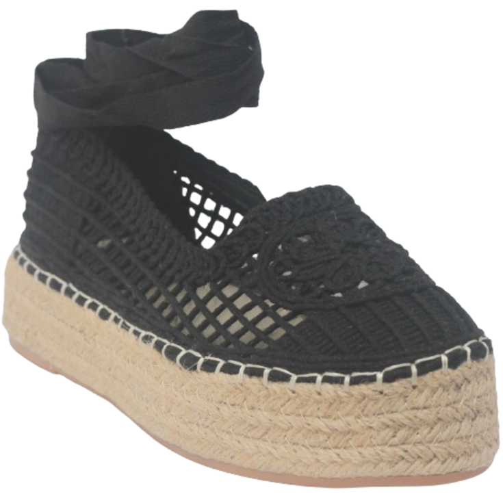 El tejido negro trenzado crea un juego de texturas y transparencias que aporta ligereza visual y un aire bohemio.