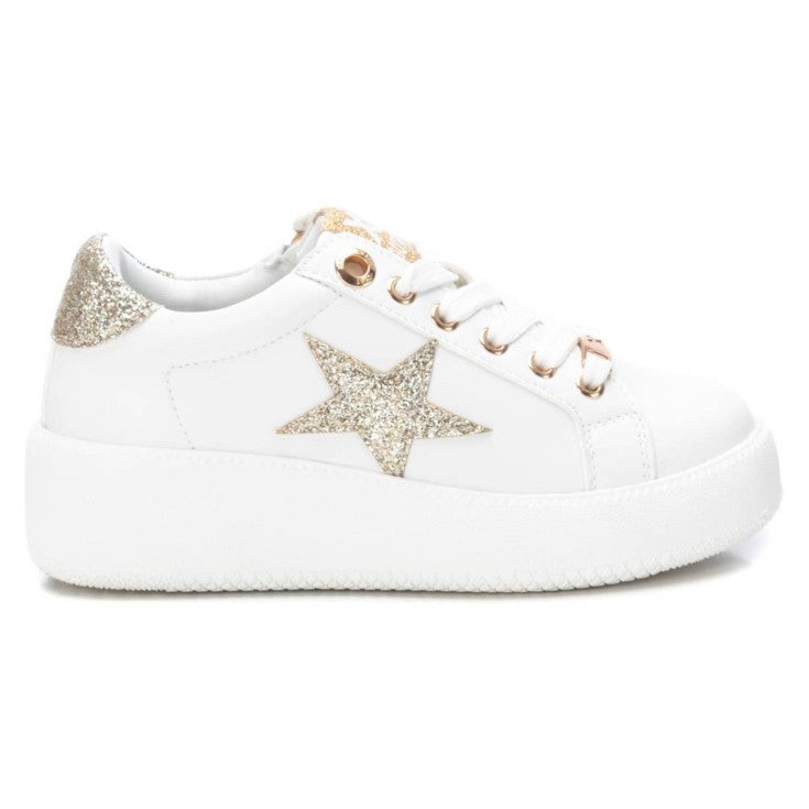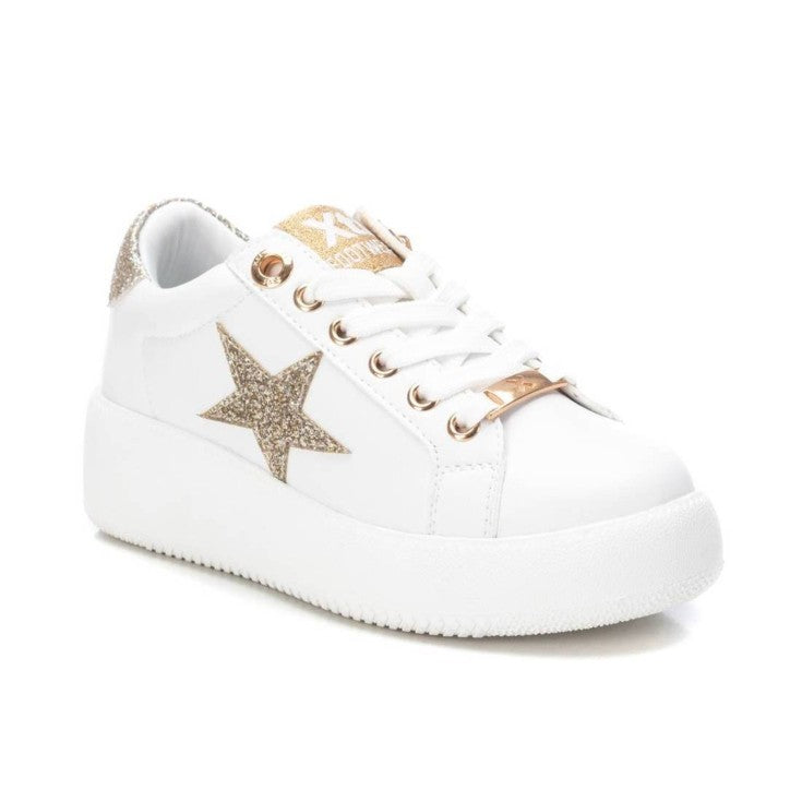Brillo, estilo y comodidad en un solo diseño: así son las Zapatillas Deportivas XTI Niña Oro Estrella, pensadas para acompañar a las más pequeñas en sus aventuras diarias. Con su base blanca y detalles en glitter dorado, son el equilibrio perfecto entre moda y diversión.